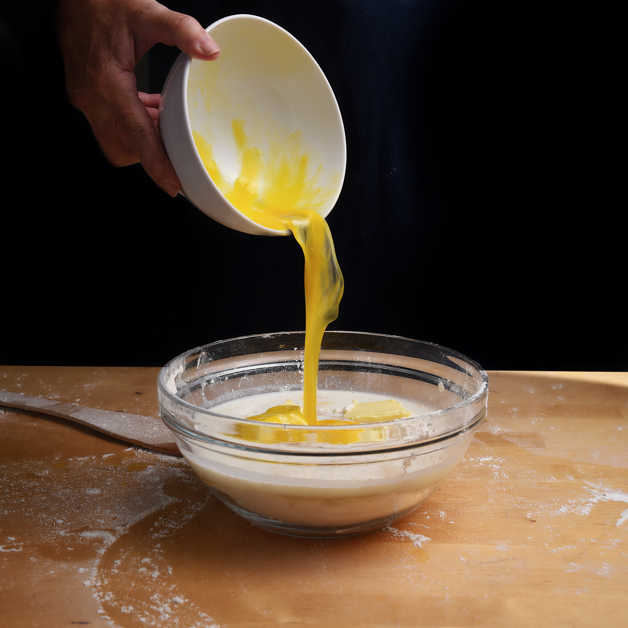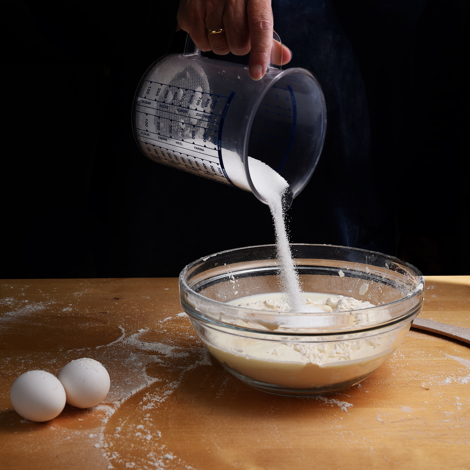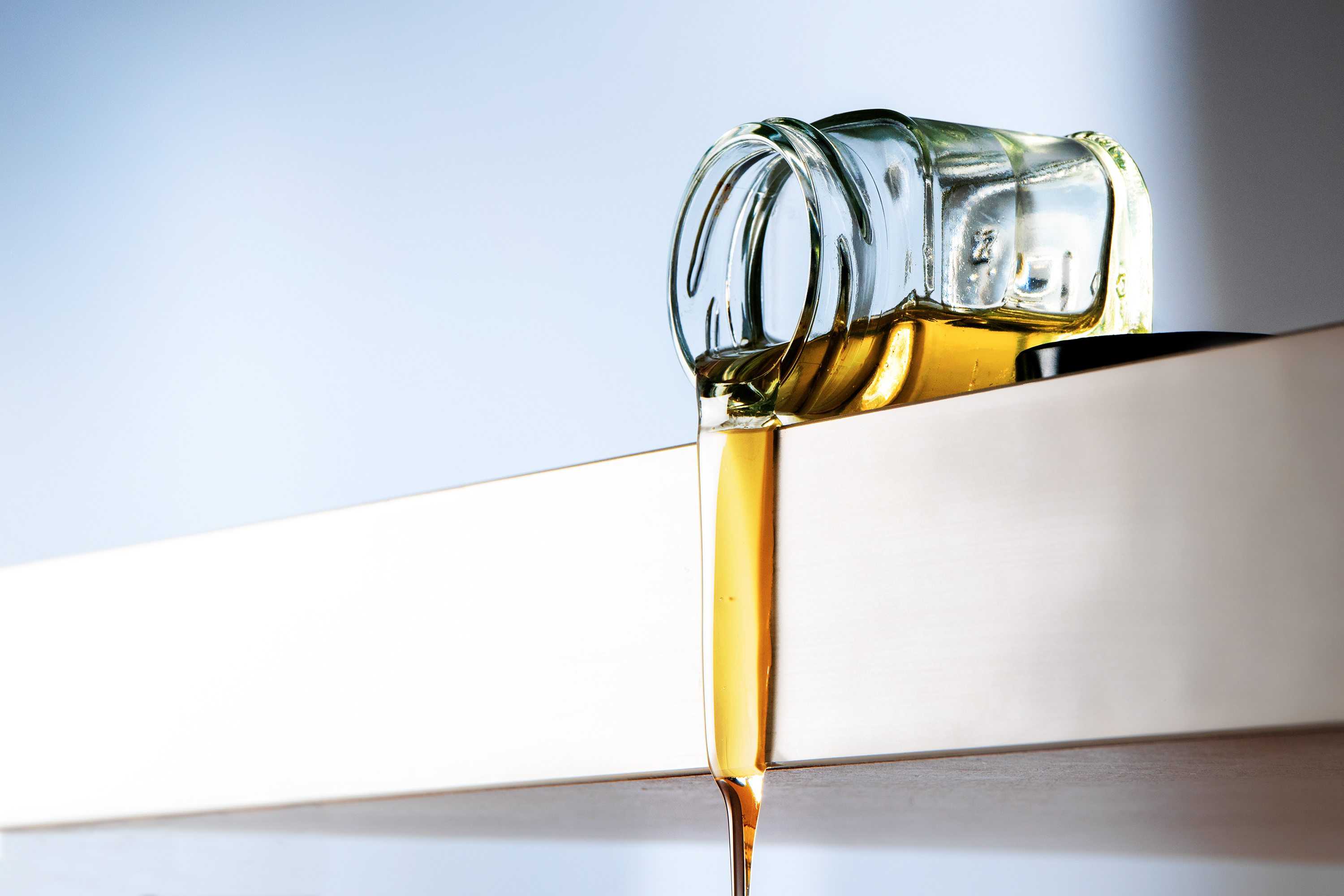 Honey flows from a tipped glass jar over the table edge, light blue background with copy space, selected focus, narrow depth of field